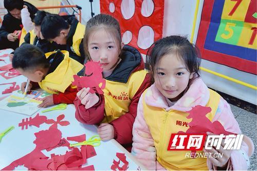 志愿者手把手指导孩子们剪纸活动现场,志愿者们提前准备了红纸、安全剪刀、模板等工具,围绕“新春元素+传统技艺”核心,以生肖马、福字、灯笼、春字等吉祥符号为创作主题,通过“讲解示范+手把手指导+自主创作”的形式,带领孩子们开启非遗剪纸体验之旅。志愿者们耐心讲解剪纸的历史渊源、基本技法与民俗寓意,让孩子们在轻松愉悦的氛围中掌握基础技巧,感受传统技艺的精妙。